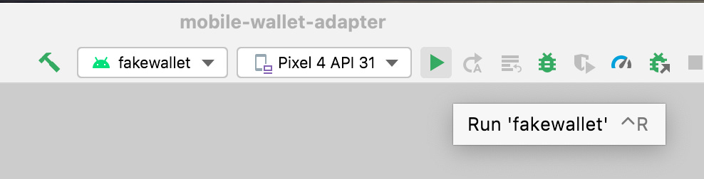 After Android Studio finishes loading the project, select “fakewallet” in the build/run configuration dropdown in the top right